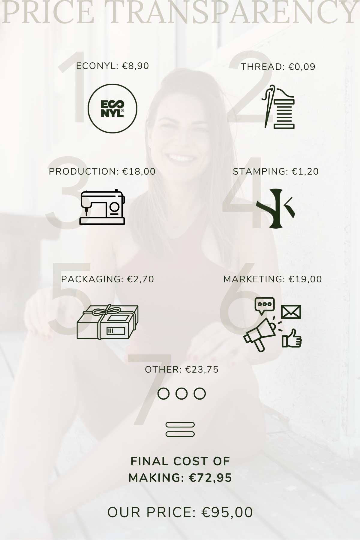 The ECONYL® fabric is comprised of 78% ECONYL and 22% Lycra. This sustainable high-end fabric is a mix between tight and comfortable. It is also breathable, retains shape, and has UPF50+.