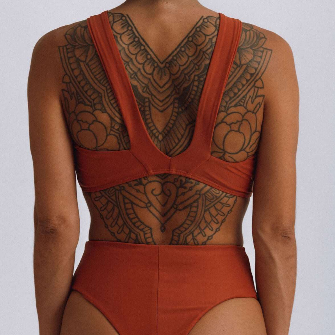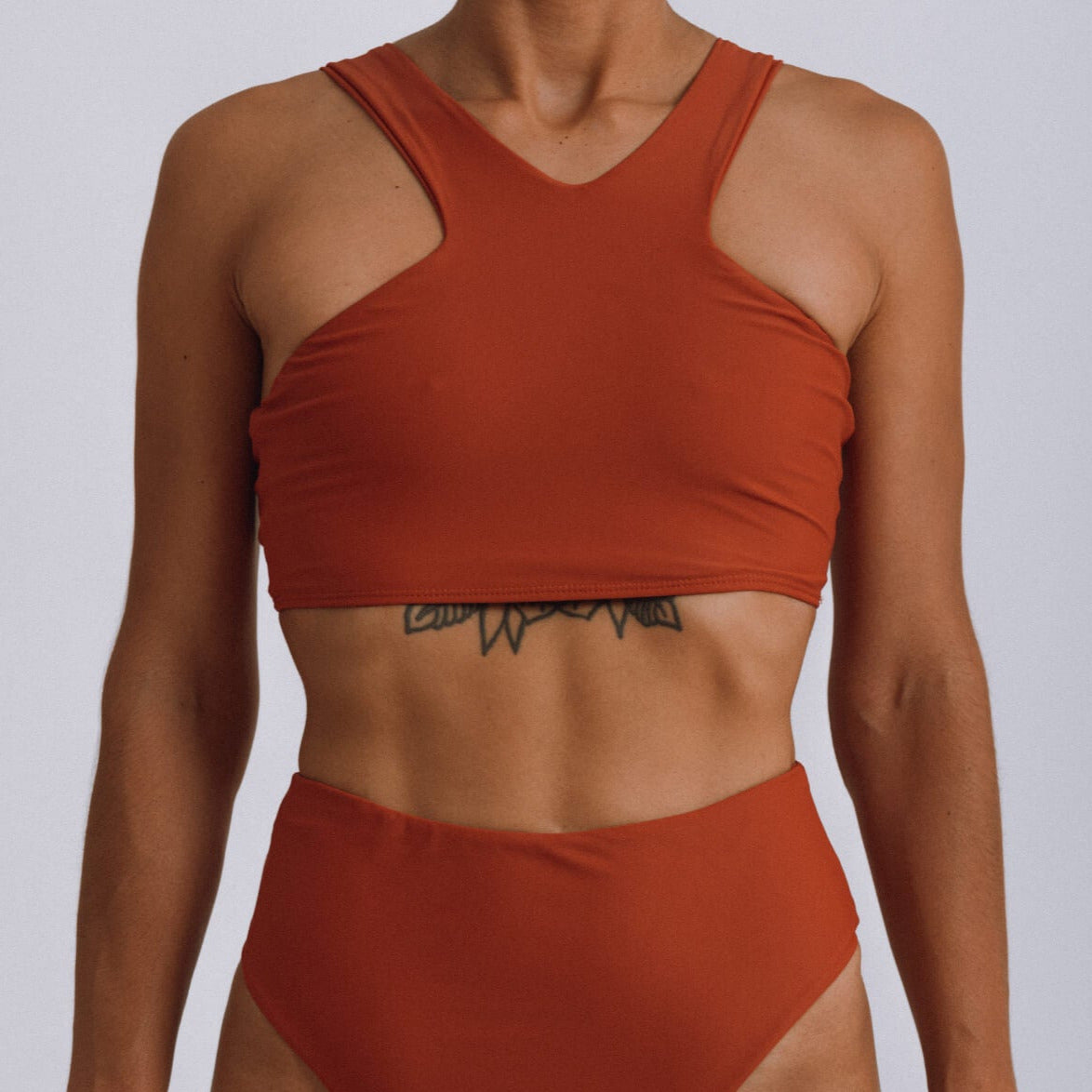 The ECONYL® fabric is comprised of 78% ECONYL and 22% Lycra. This sustainable high-end fabric is a mix between tight and comfortable. It is also breathable, retains shape, and has UPF50+.